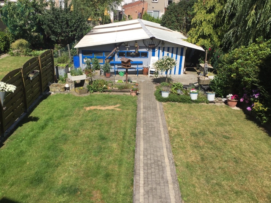 Mooie tuin en atelier achter in de tuin.