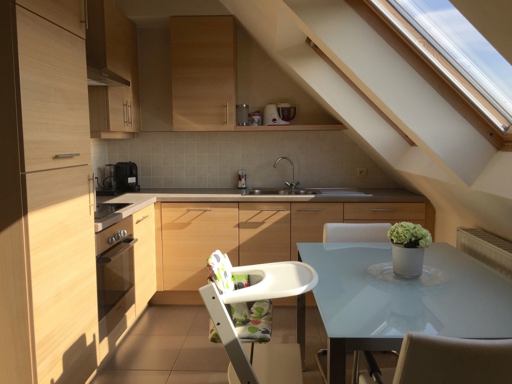 3de verdieping: inkom, leefruimte/eetplaats met aansluitend zonnig terras, keuken (oven, kookplaat met dampkap, koelkast en vaatwasmachine) met berging en toilet.