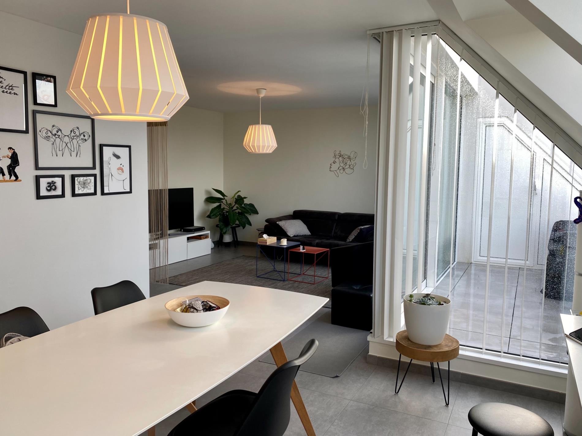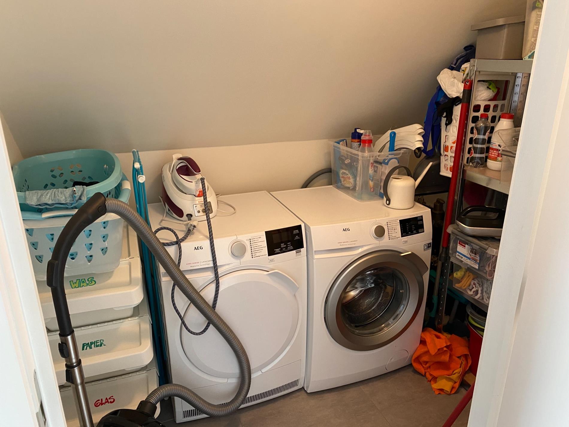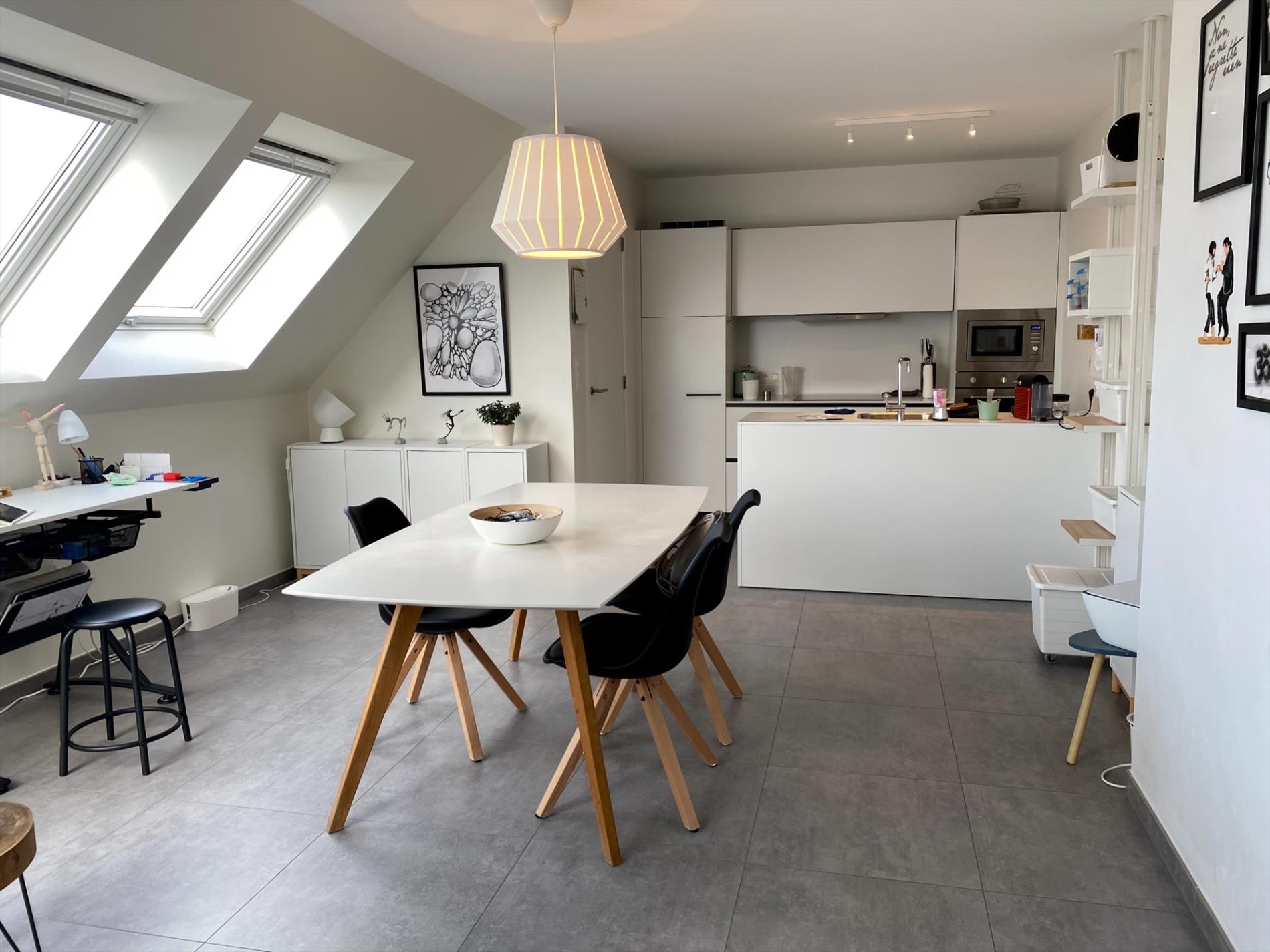 2de verdieping: leefruimte en eetplaats met mooi terras van 6,5m2 (+ extra berging), open en degelijk geïnstalleerde keuken (inductiekookplaat met dampkap, oven, microgolfoven, vaatwasmachine, koelkast) met berging (aansluiting voorzien voor wasmachine), apart toilet.