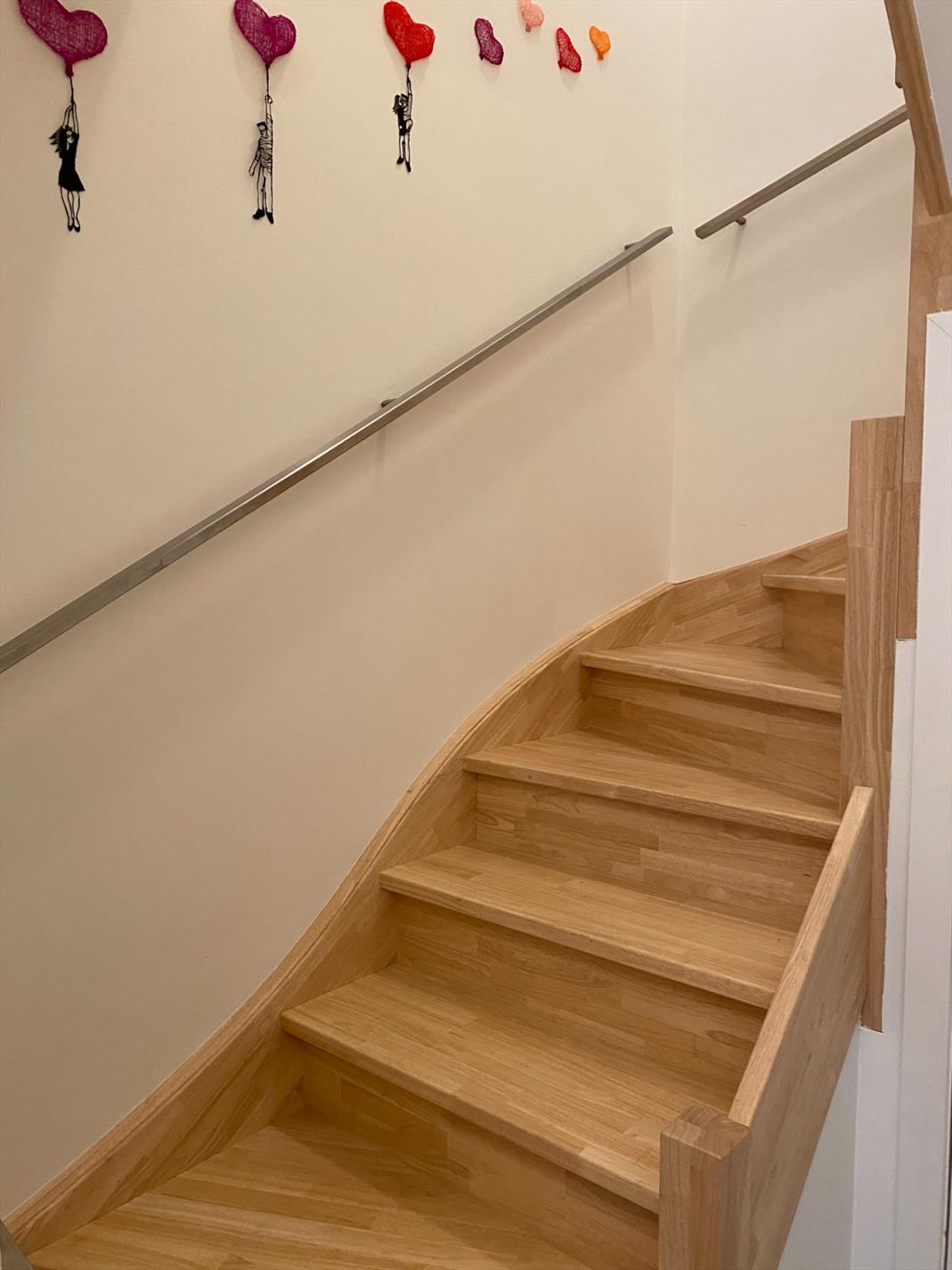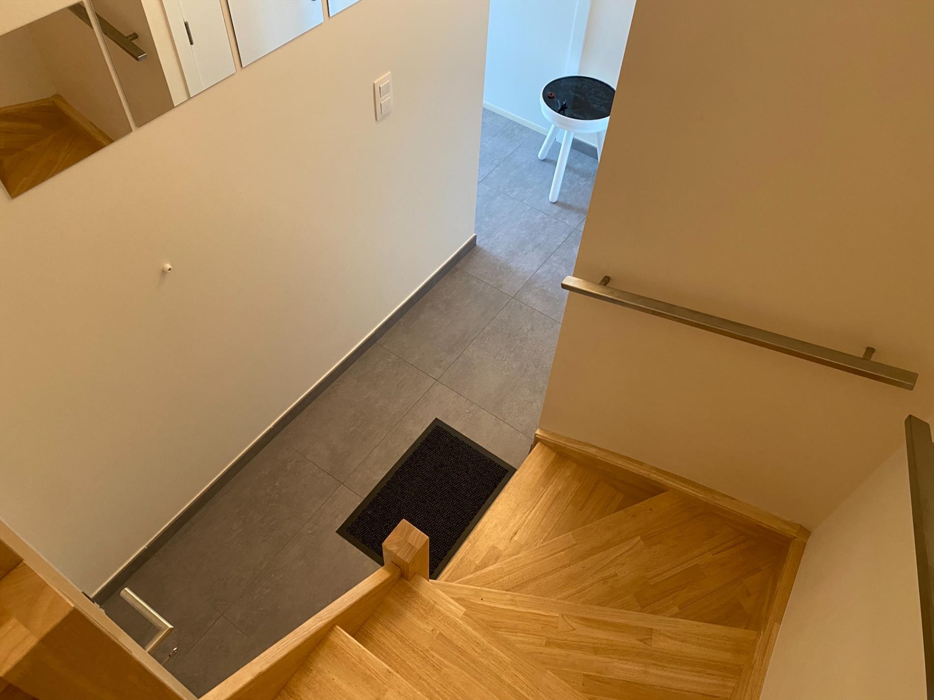 Trap naar de 2 slaapkamers (16,9m2 en 12,5m2) en badkamer (inloopdouche, dubbele lavabo en toilet) op de verdieping.