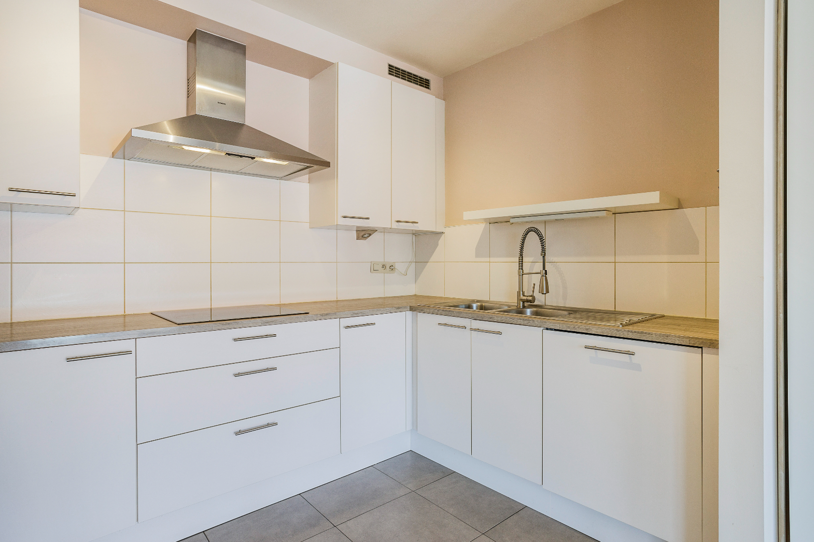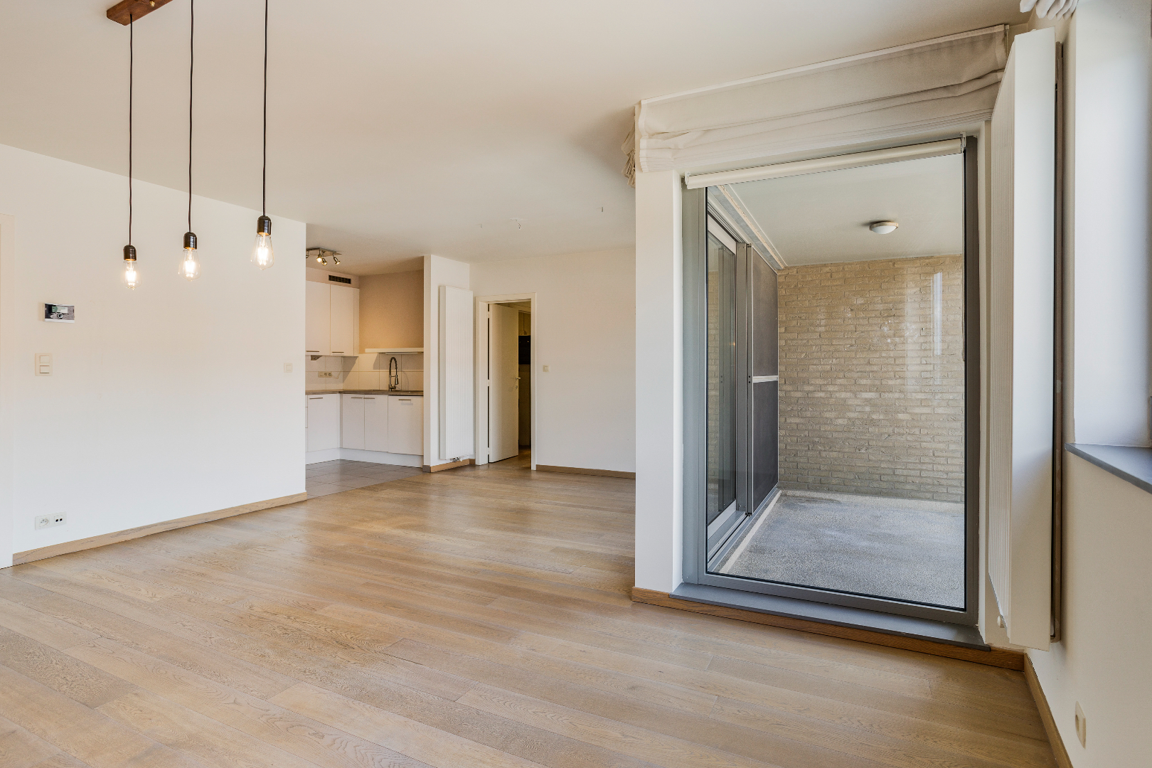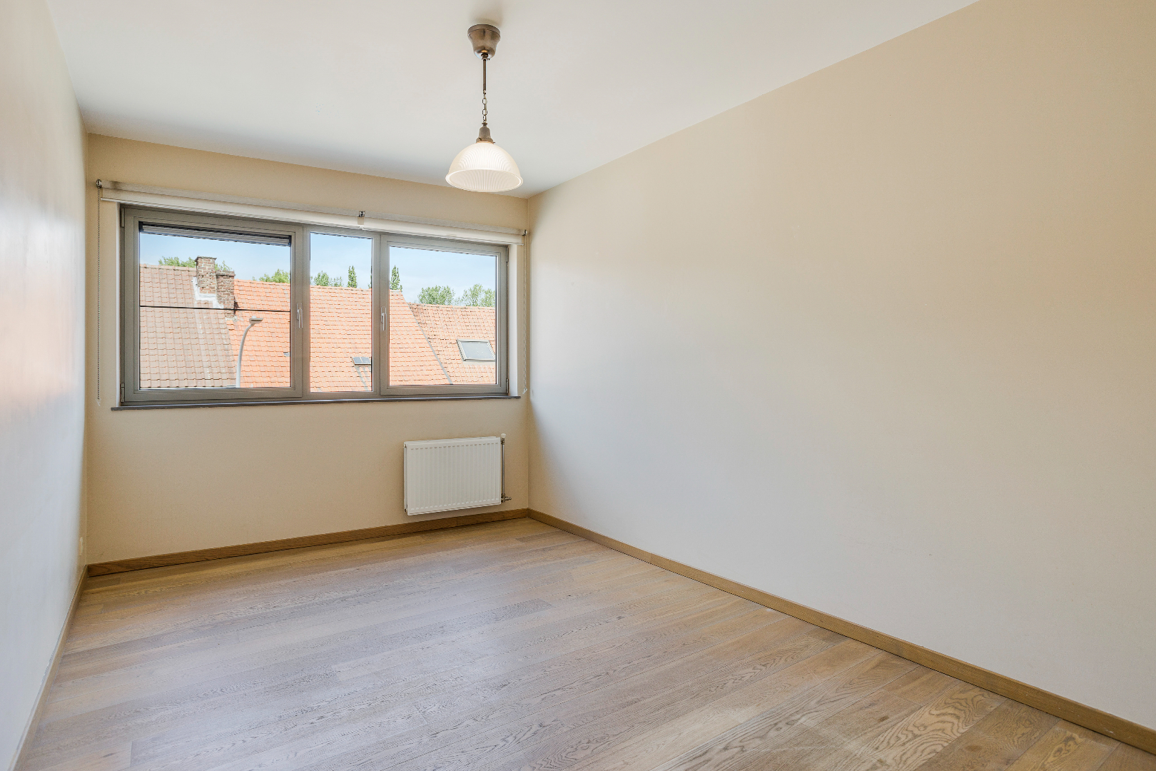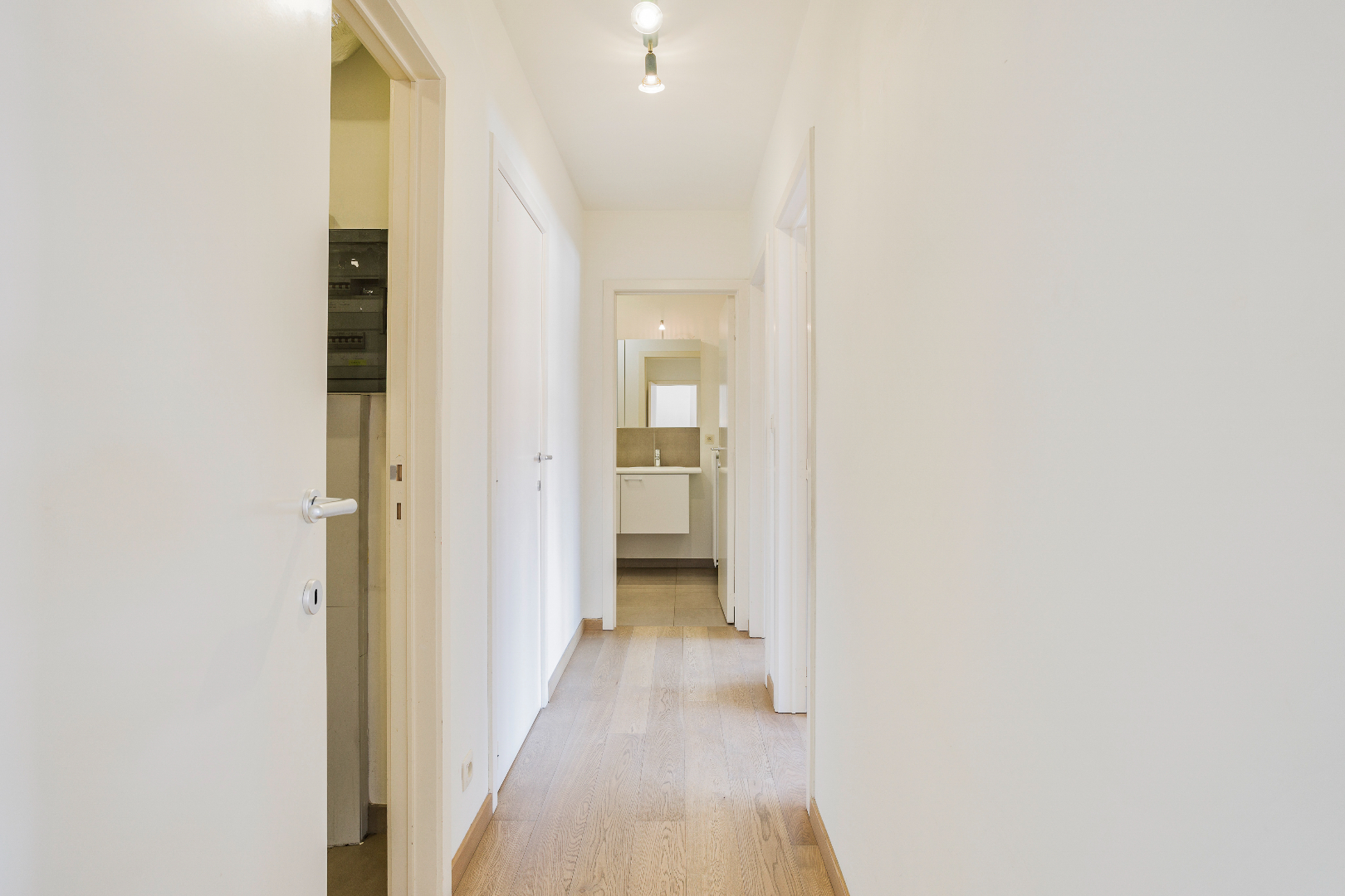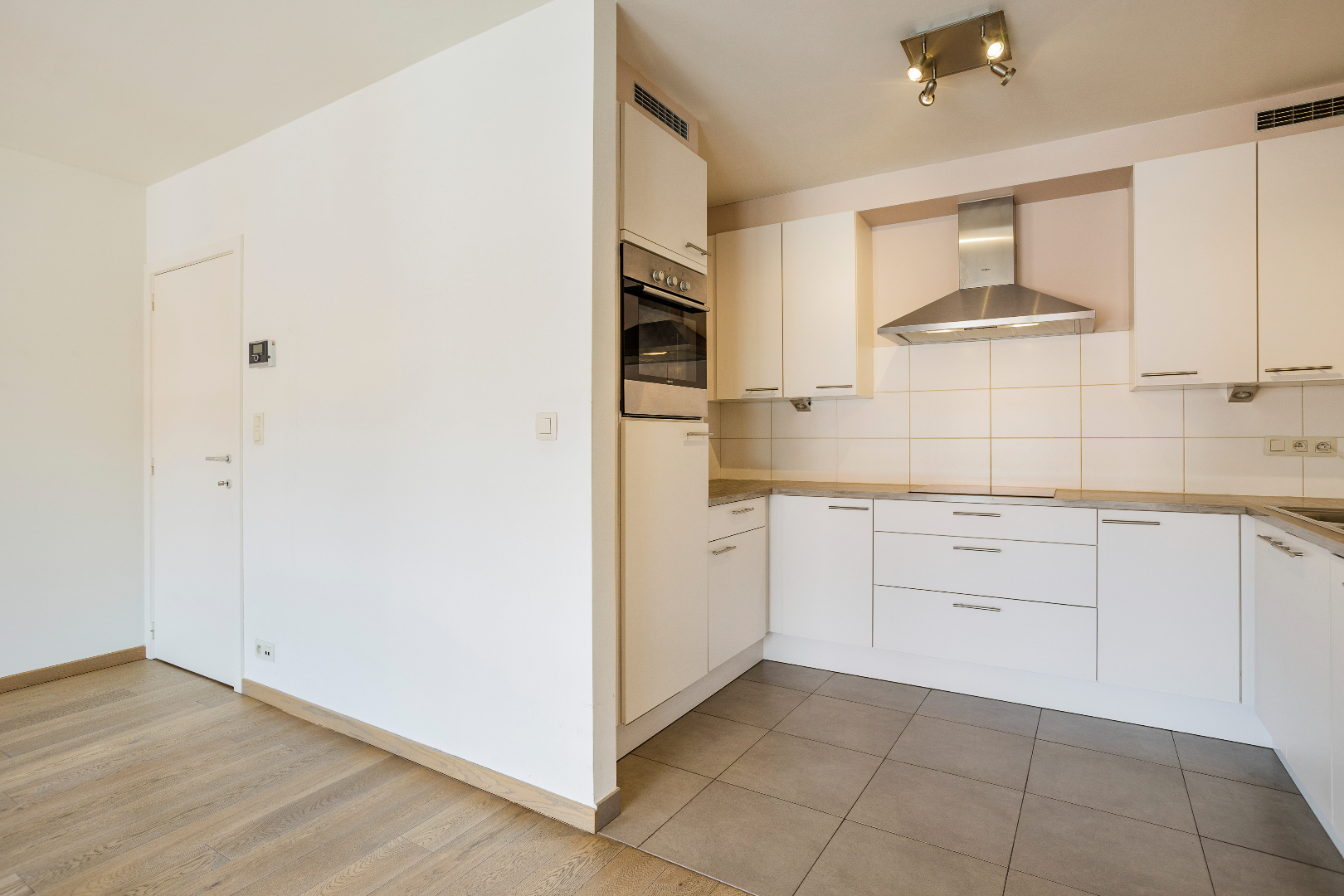 Inkom, leefruimte en eetplaats (mooie parketvloer), keuken met ingebouwde toestellen van Siemens (kookplaat, dampkap, koelkast, oven, en vaatwasmachine), overdekt terras, 2 volwaardige slaapkamers, badkamer (dubbele lavabo, douche én ligbad), 2 (!) aparte toiletten en berging. De mooie parketvloer in de leefruimte en de slaapkamers zorgt voor een warme uitstraling.