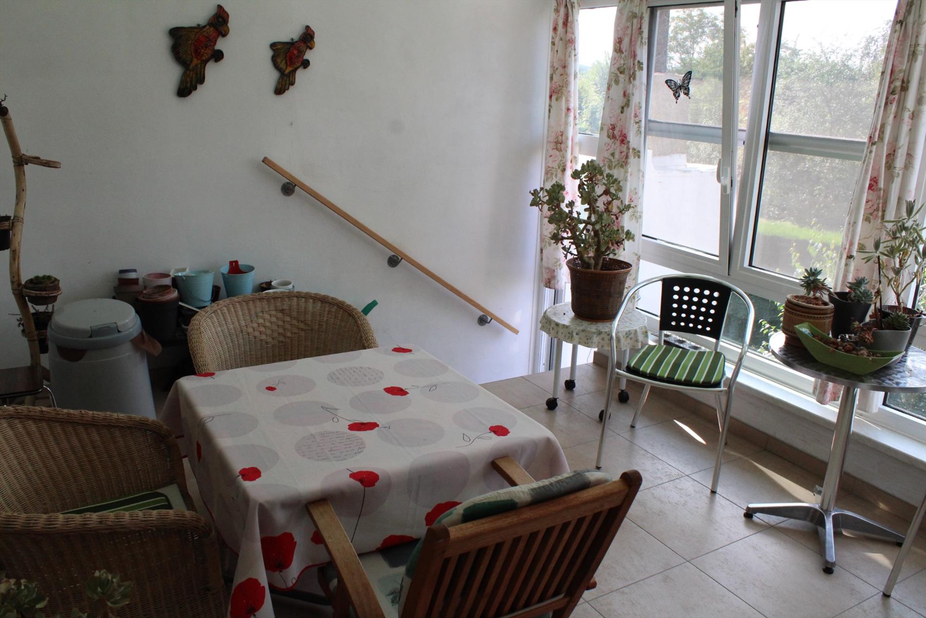 1ste verdieping: traphal, leefruimte met bureau-hoek, aparte keuken en veranda met toegang tot terras via trap.