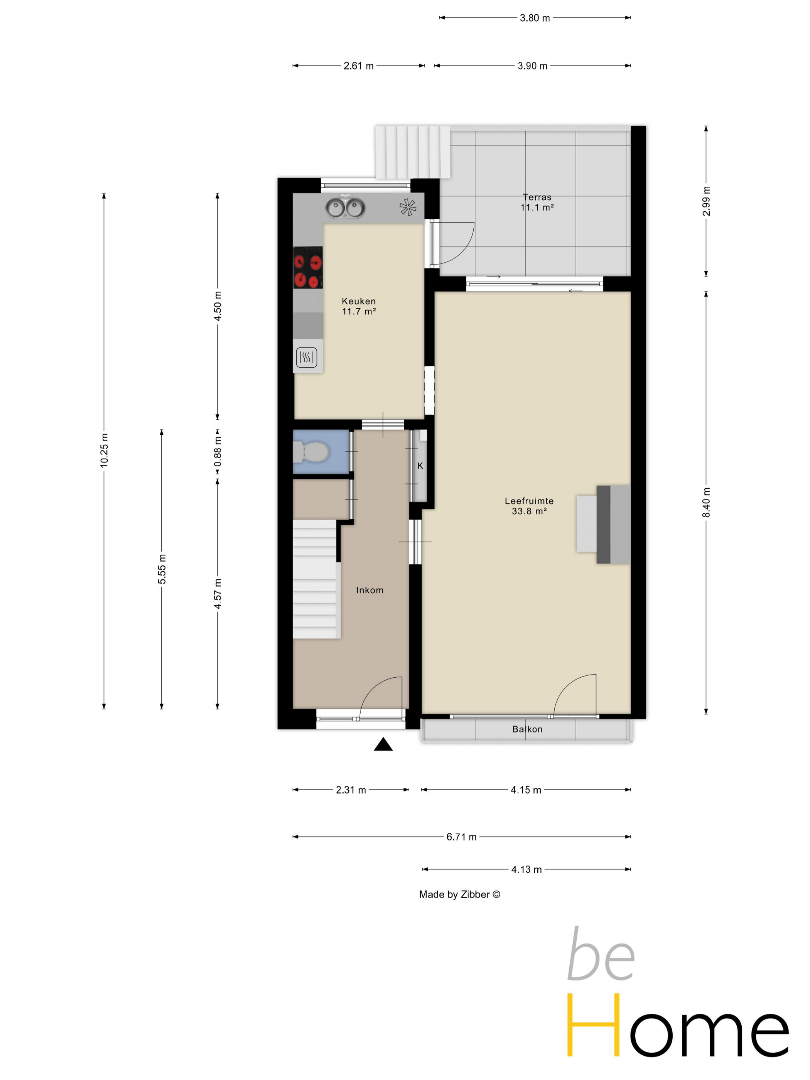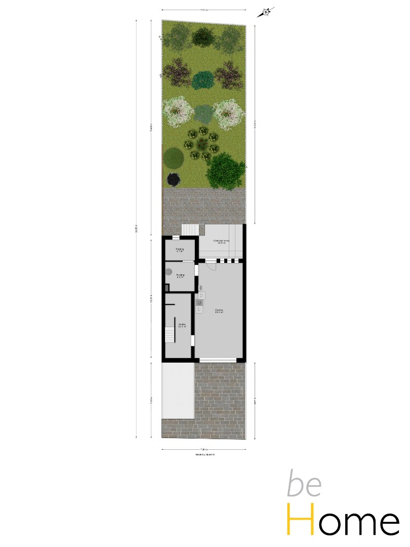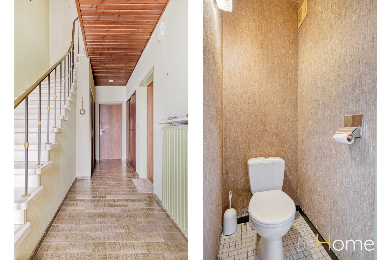 Gelijkvloers: inkomhal, toilet, leefruimte, keuken, terras en zonnige tuin,