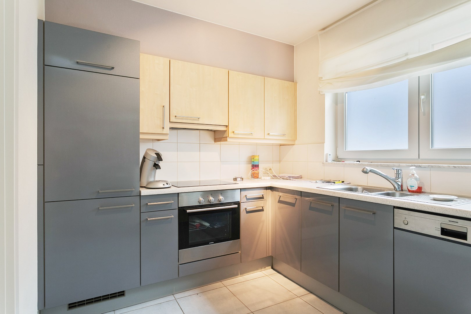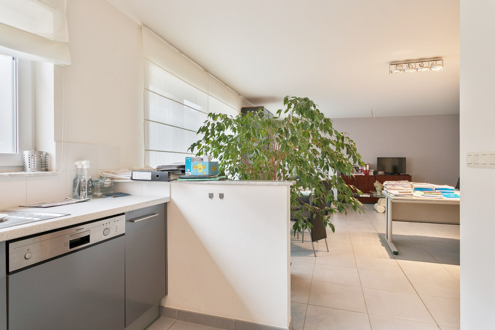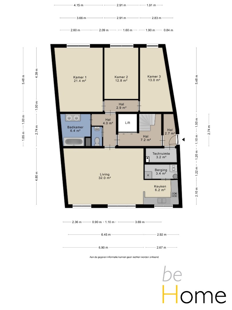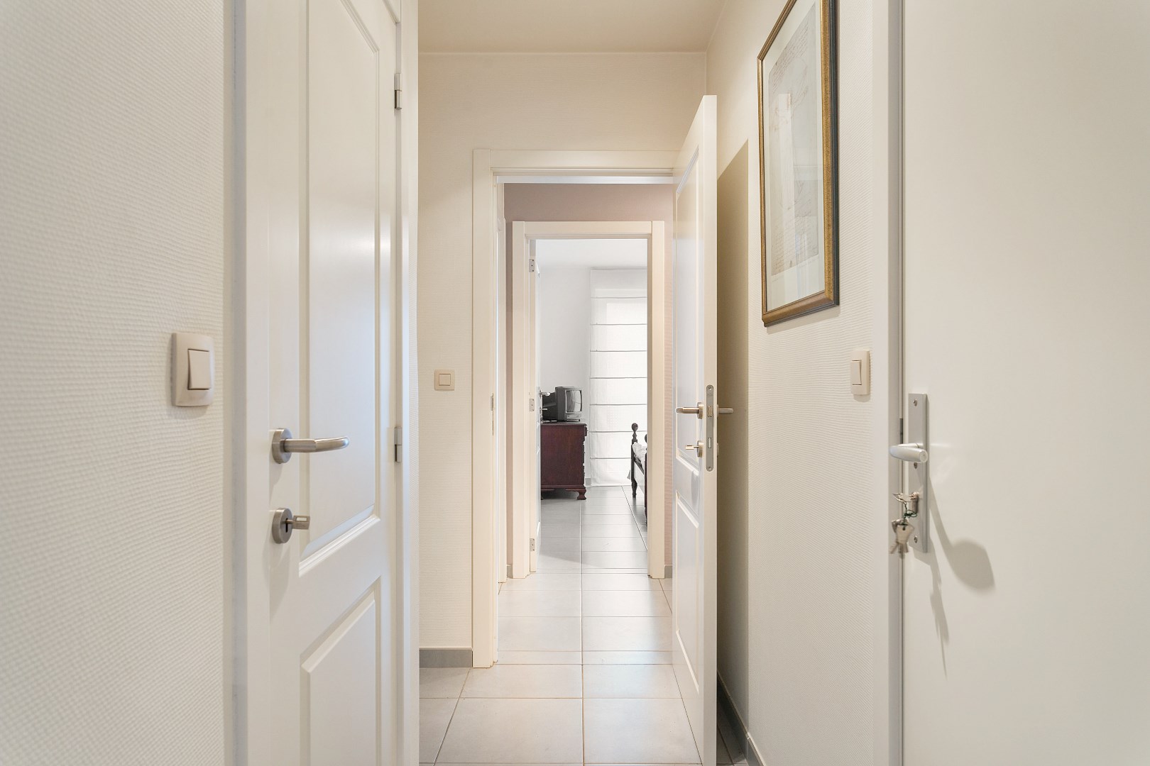 Het appartement is ingedeeld als volgt: inkom, leefruimte/eetplaats, open keuken met aansluitend berging. 3 slaapkamers (21,4m2-12,8m2-13m2), badkamer (ligbad/douche en dubbele lavabo), apart toilet.