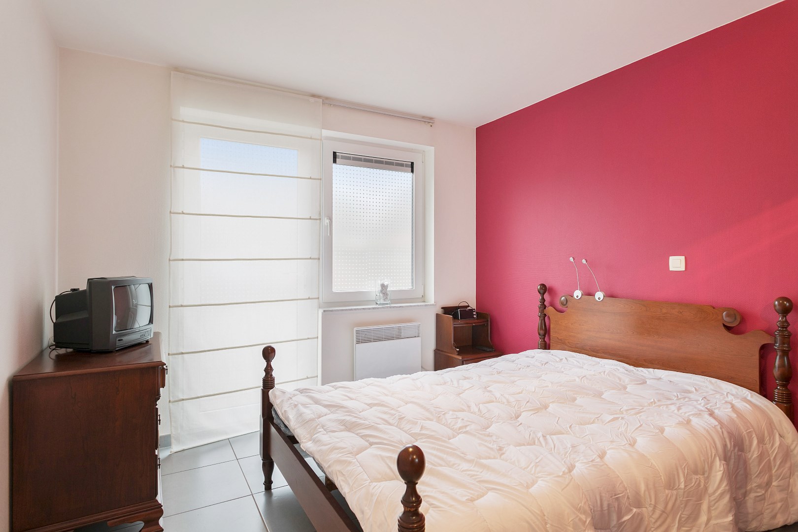 Verwarming op elektriciteit (accumulatieverwarming in de leefruimte, directe verwarming in slaapkamers en badkamer).