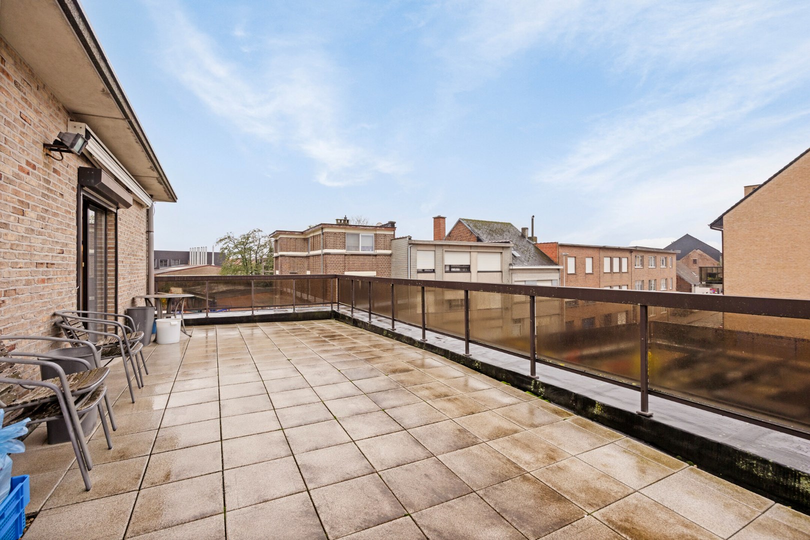 Op de 2de verdieping bevindt zich het 2de appartement van 85m2: inkomhal, leefruimte met aansluitend een groot en opnieuw zonnig terras. Aparte keuken, slaapkamer (10,6m2), badkamer en zeer grote berging/ extra kamer.