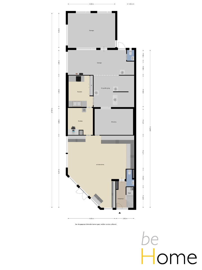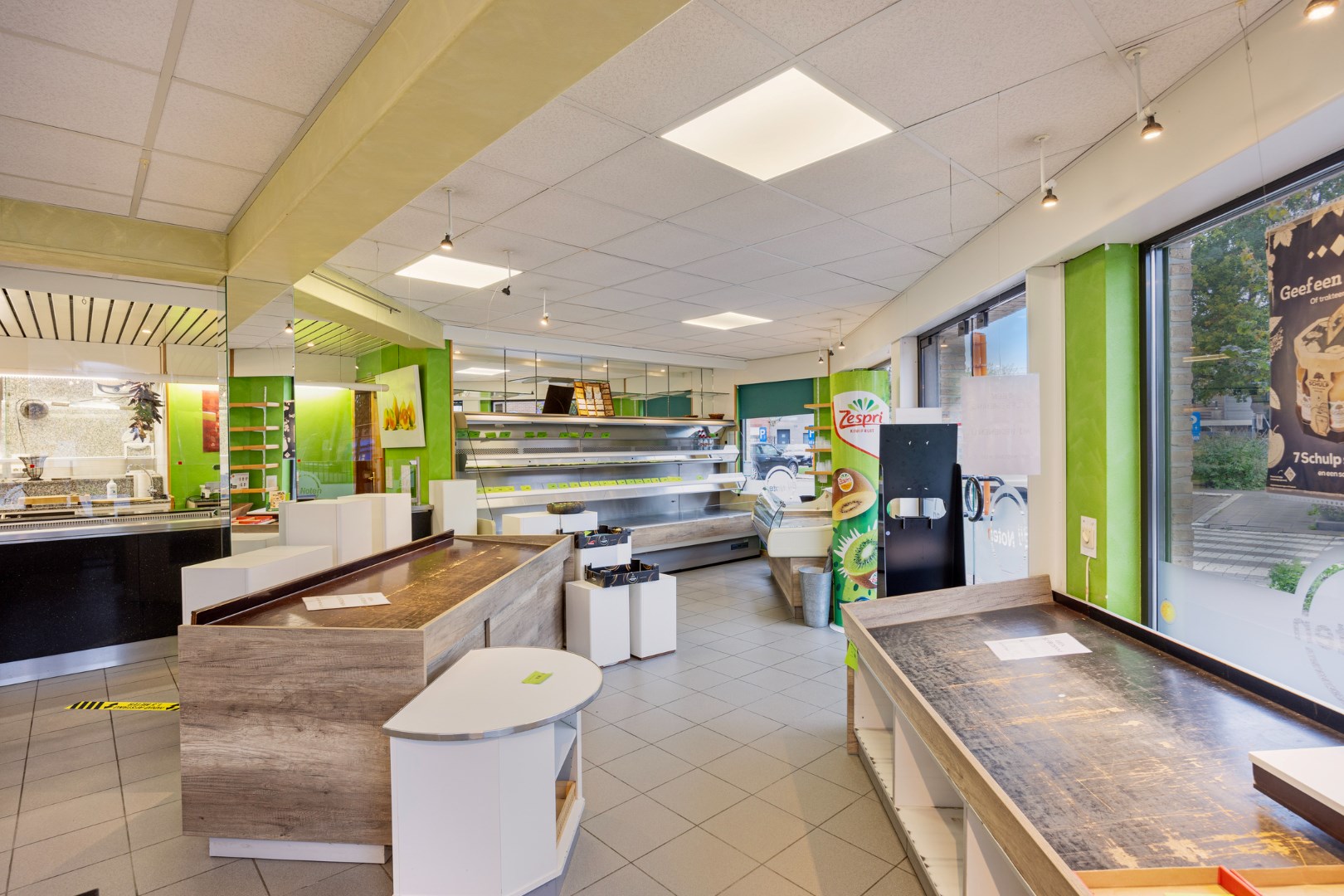 Op het gelijkvloers bevindt zich de handelsruimte waar de huidige eigenaars een succesvolle groenten- en fruitwinkel uitbaatten. De grote winkelruimte, koelcel, keuken, bureau, garages met grote sectionale poort (makkelijk laden en lossen), bieden heel wat mogelijkheden voor een ondernemer.