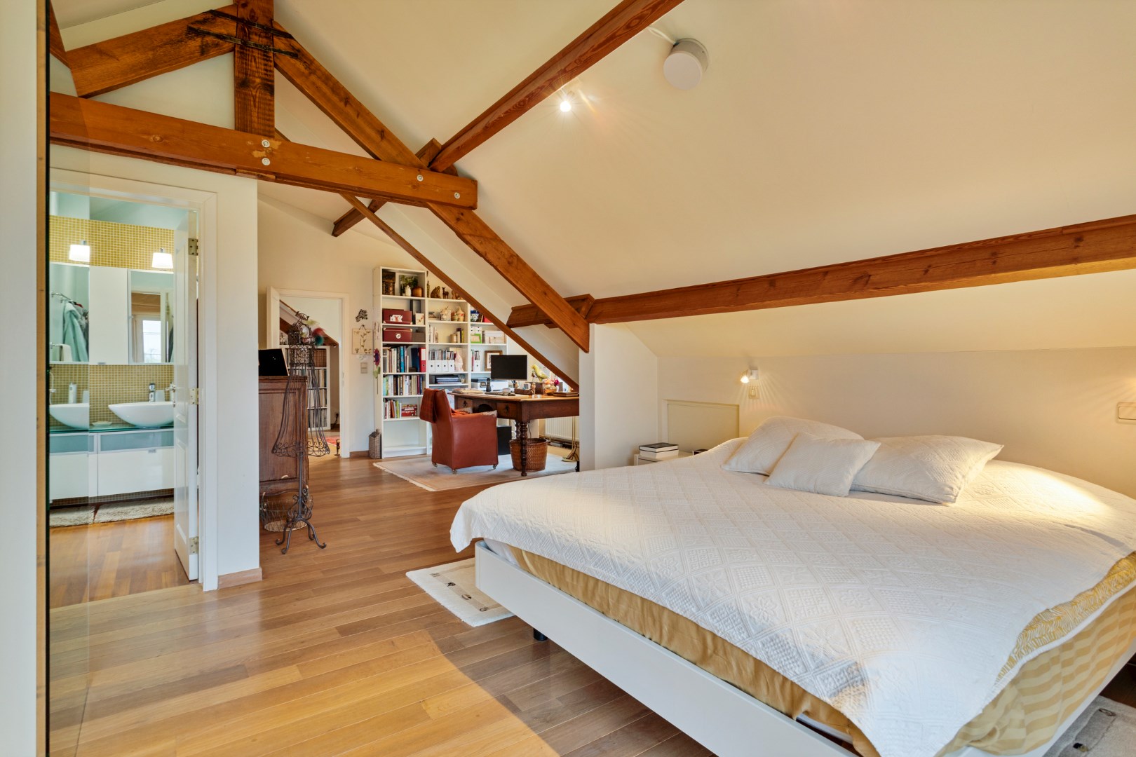 Of als zorgwoning. Naast de keuken, badkamer, woon- en slaapkamers op de benedenverdieping is de volledige bovenverdieping immers perfect ingericht als woonruimte met ook een master bedroom/dressing/badkamer. Tel daarbij de ruime garage en de onderhoudsvriendelijke en gezellige tuin met mooie overdekte terrassen, en je vindt hier alles om van dit huis je thuis te maken!
