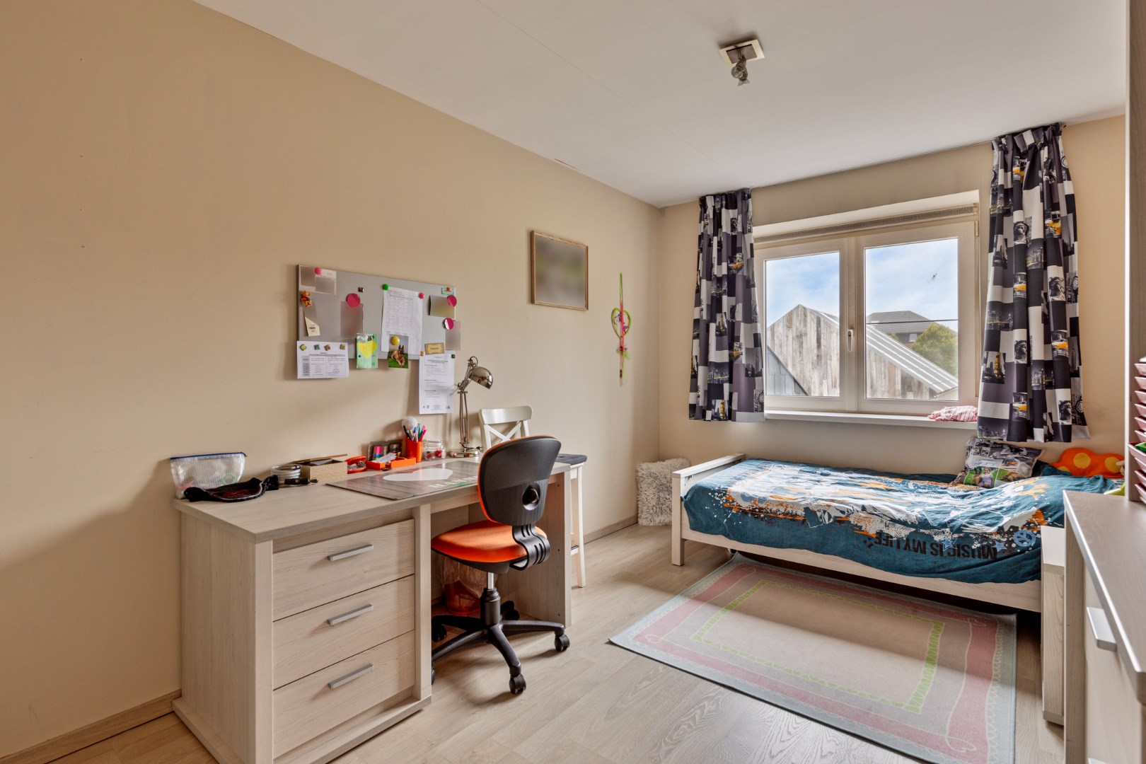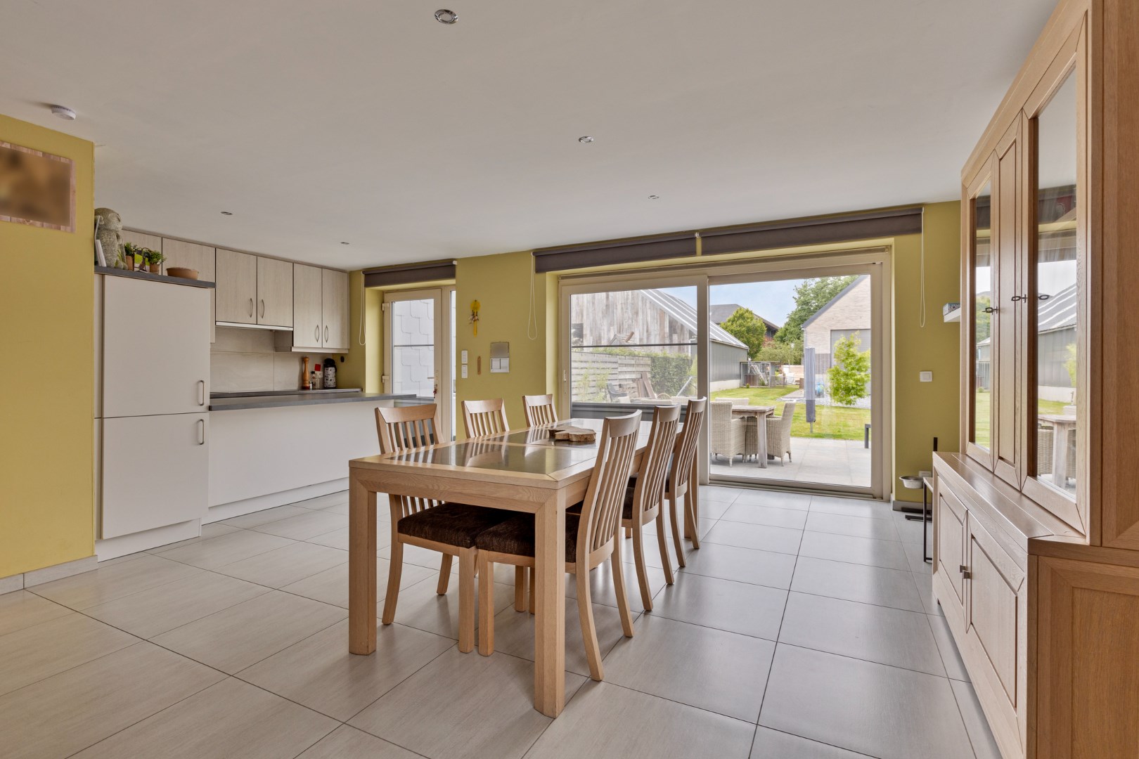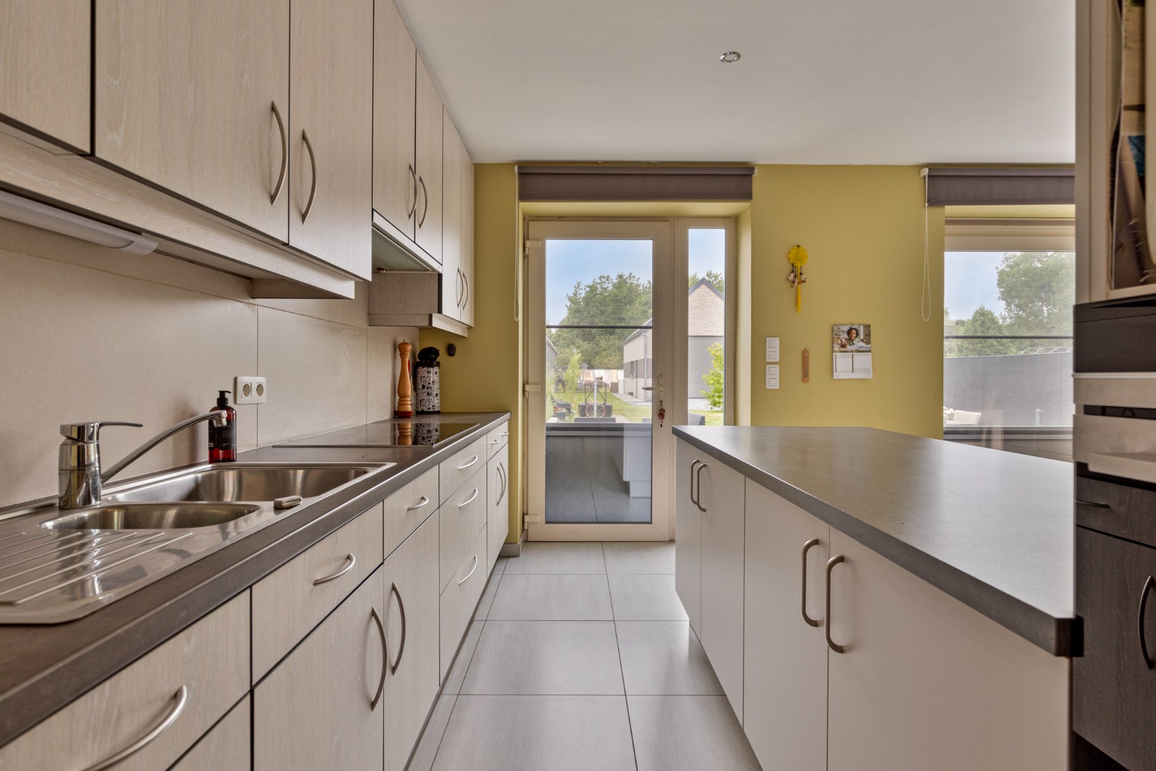 De gelijkvloerse verdieping beschikt over een inkomhal, een leefruimte waar je via het brede schuifraam meteen op je aangelegde terras staat. De keuken is open en geïnstalleerd, en extra handig is de aanpalende bijkeuken/wasruimte. Verder is er op deze verdieping nog plaats voor een bureau, en een apart toilet.