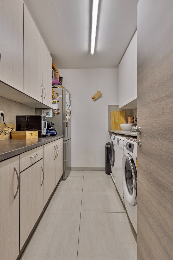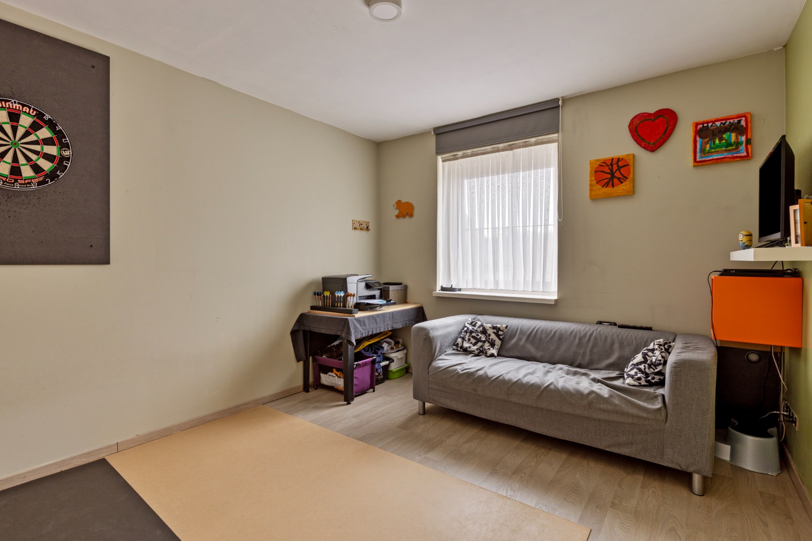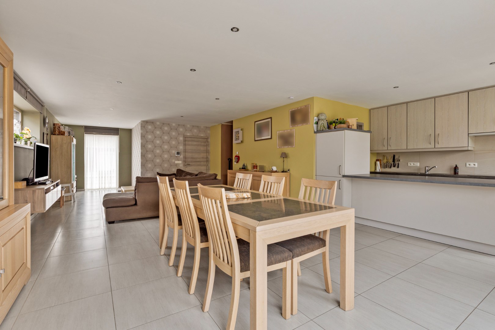 De gelijkvloerse verdieping beschikt over een inkomhal, een leefruimte waar je via het brede schuifraam meteen op je aangelegde terras staat. De keuken is open en geïnstalleerd, en extra handig is de aanpalende bijkeuken/wasruimte. Verder is er op deze verdieping nog plaats voor een bureau, en een apart toilet.