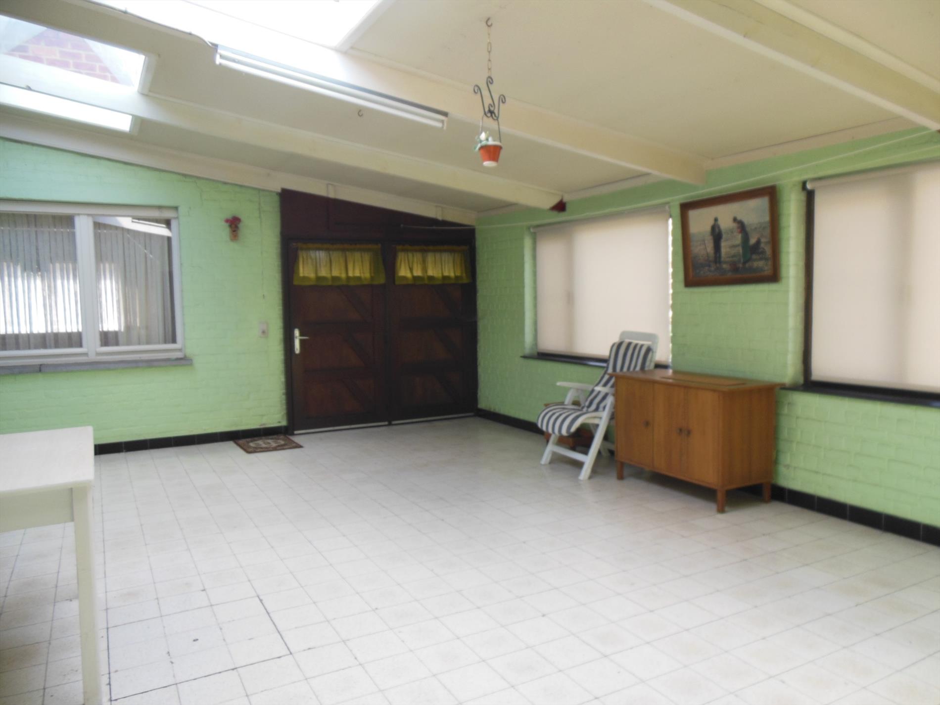 Gelijkvloers: inkomhal, leefruimte, keuken, veranda (33m2), compacte badkamer, werkruimte (40m2), en toilet. Garage.