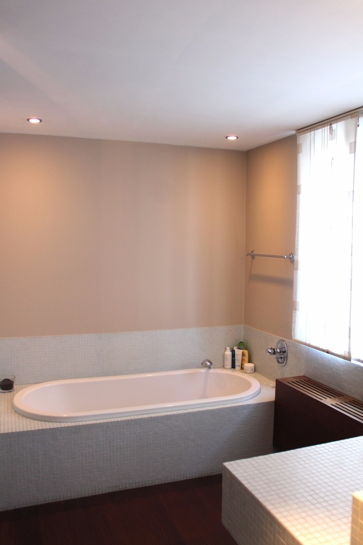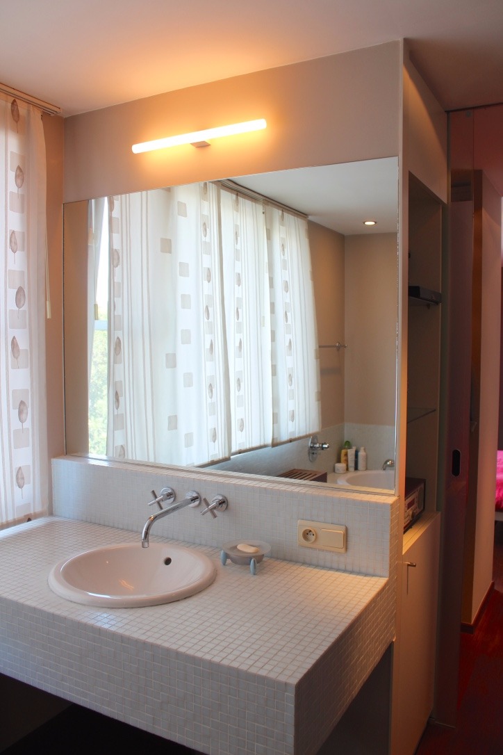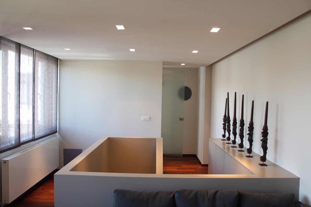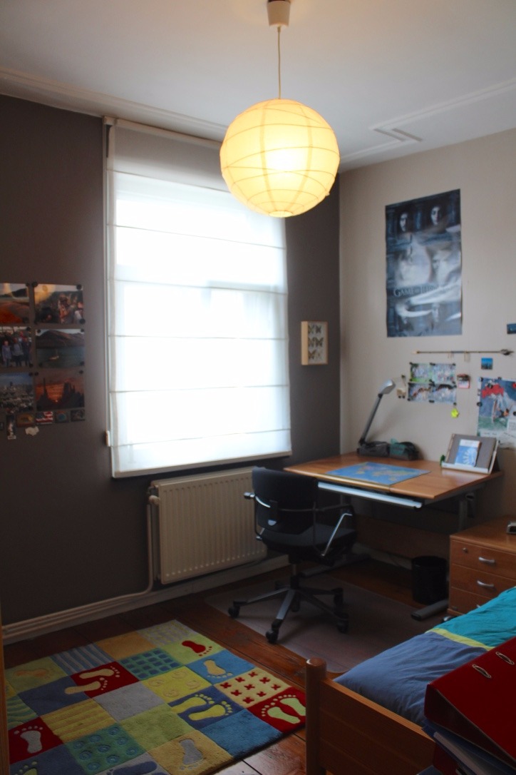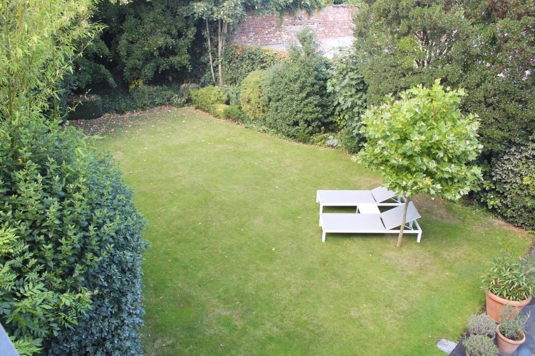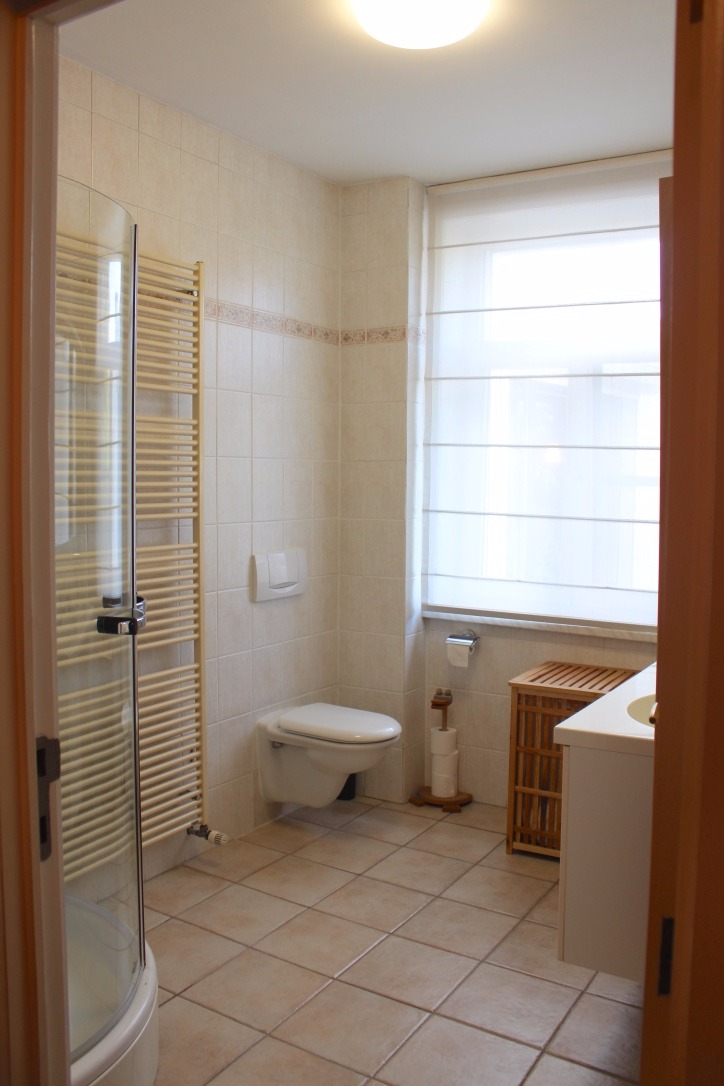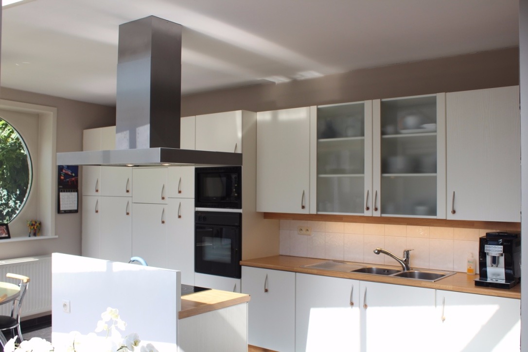 De leefruimte, de eetplaats en de keuken, genieten dankzij de grote raampartijen, van veel lichtinval en mooi zicht op de zonnige stadstuin. De keuken is uitgerust met oven, nieuwe kookplaat, dampkap, microgolfoven, koelkast en vaatwasmachine.