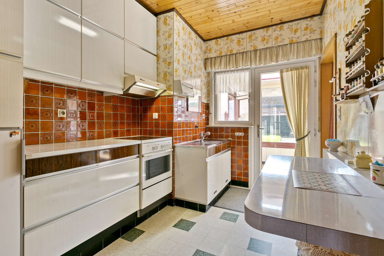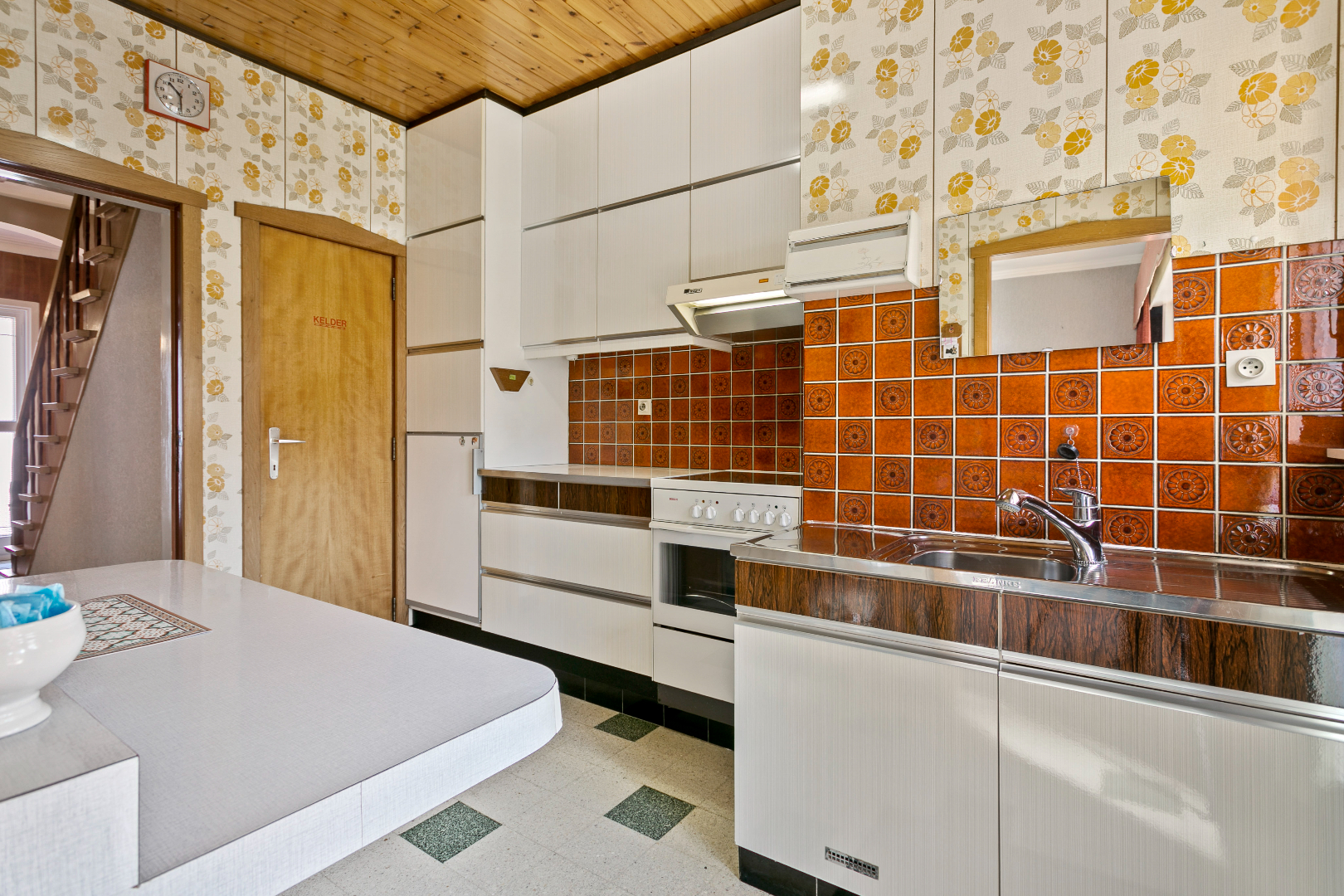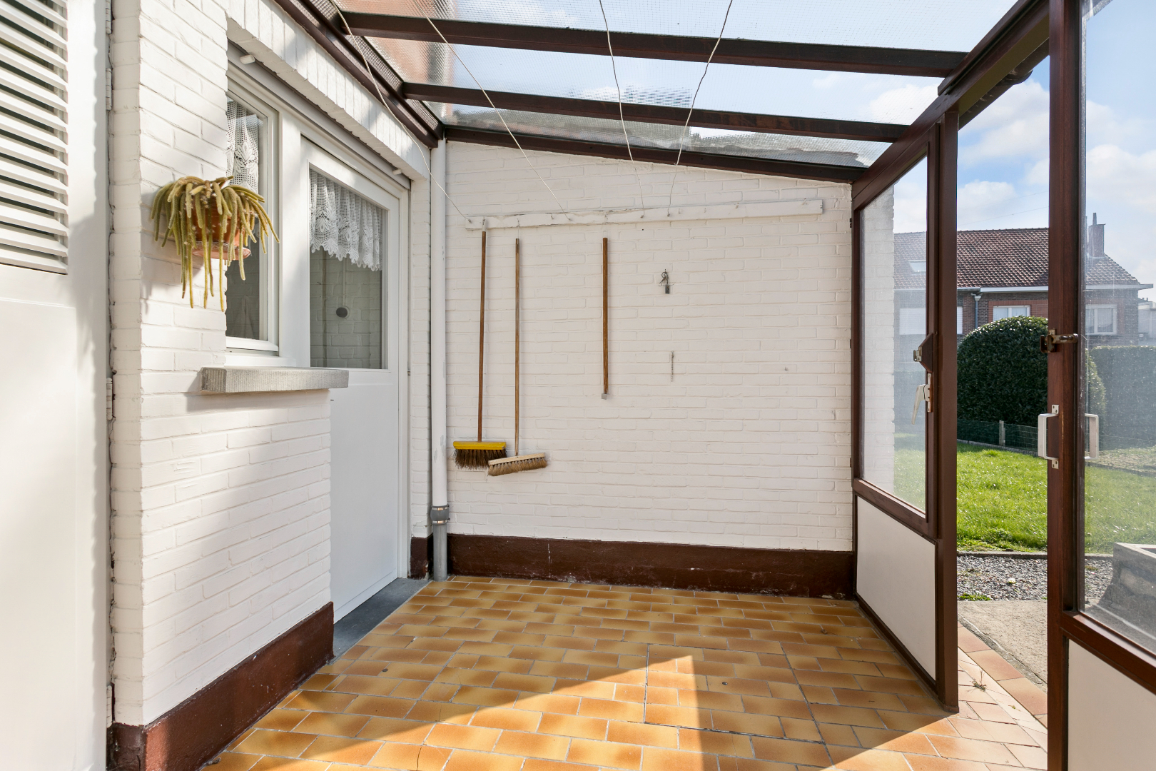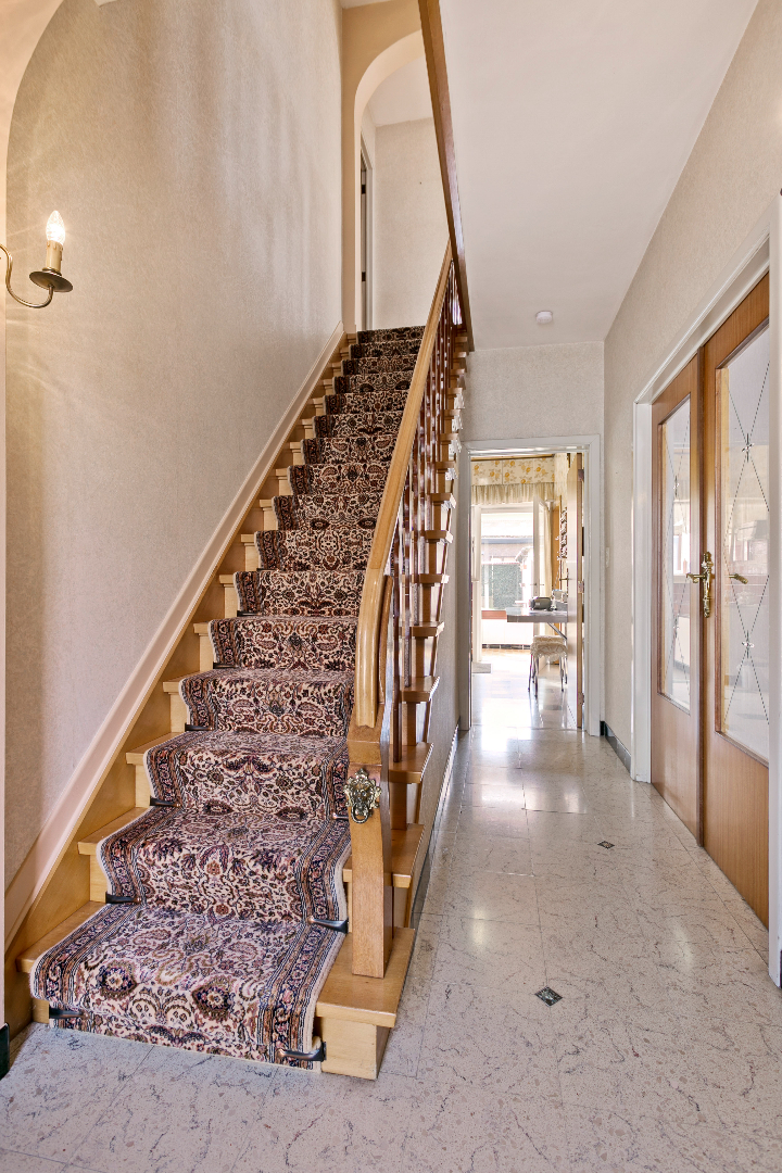 Gelijkvloers: inkomhal, leefruimte/eetplaats, aparte keuken, veranda.
