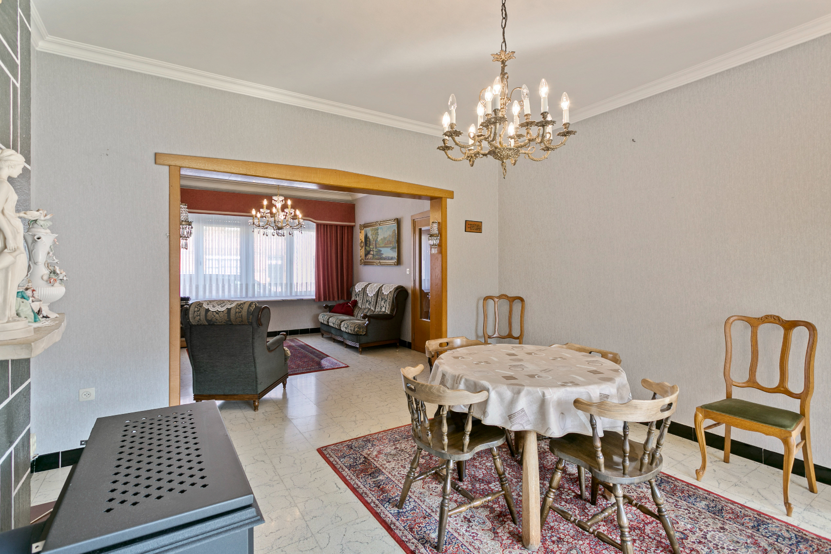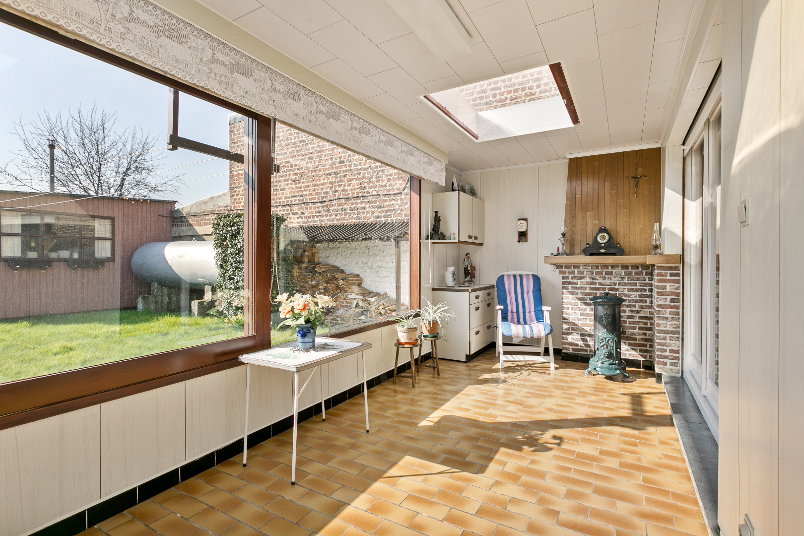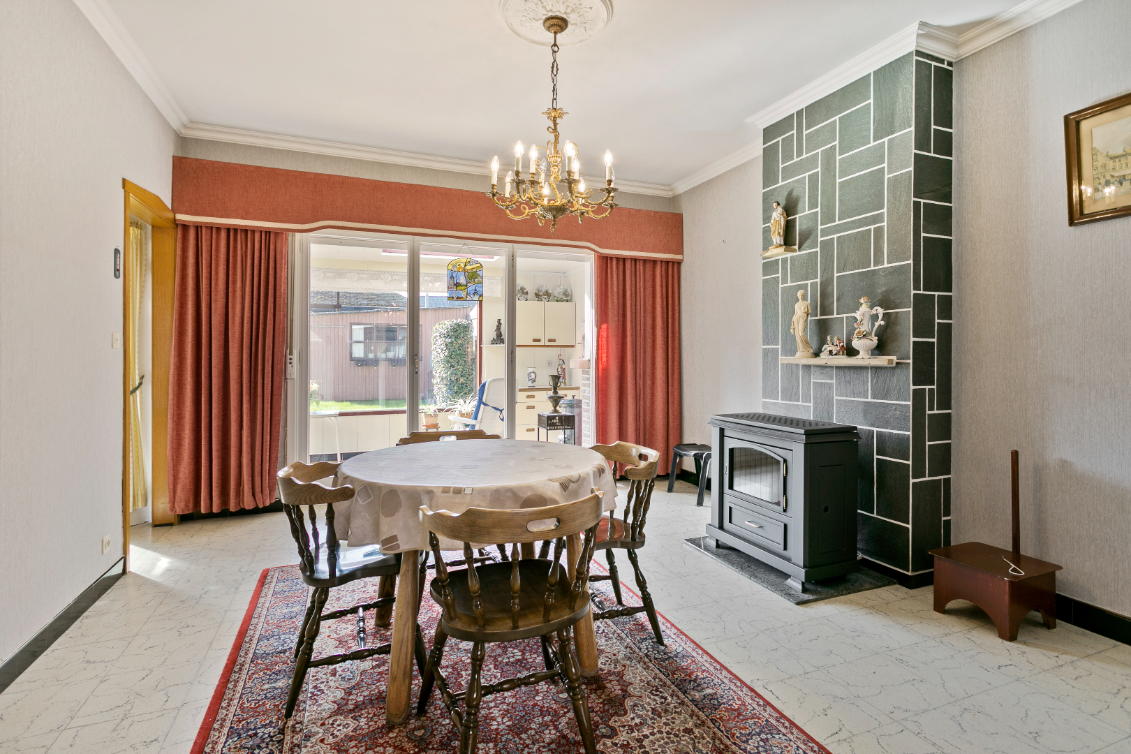 Verwarming: nieuwe kachel op mazout + houtkachel in de leefruimte, extra kachel in de veranda.