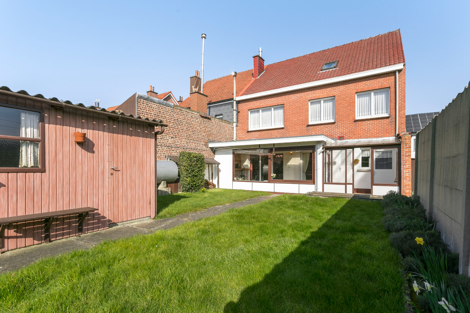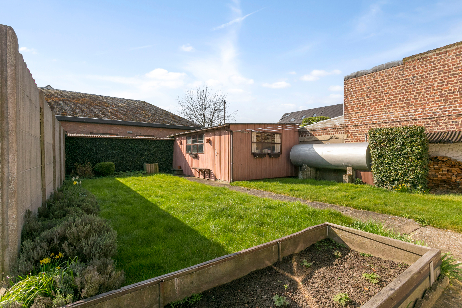 Leuke zonnige tuin met werkruimte.