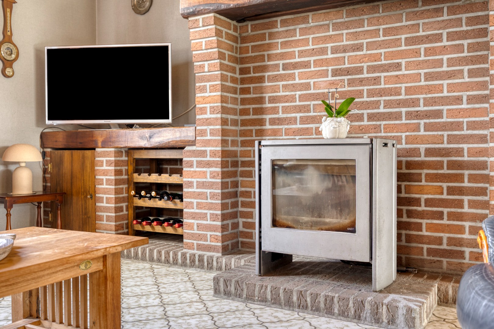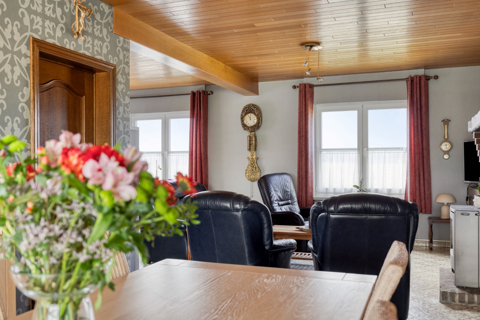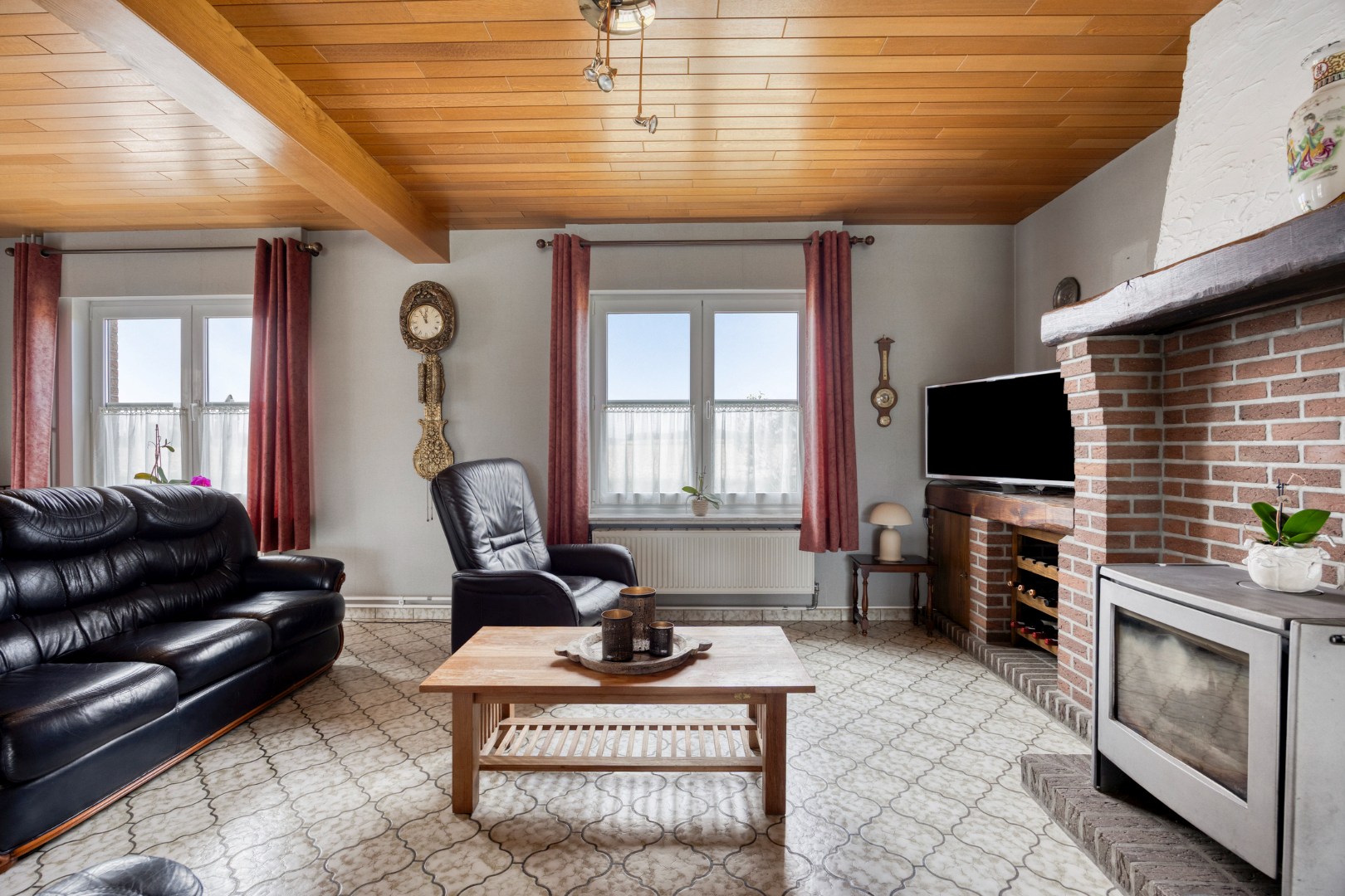 - Gelijkvloers: inkomhal, leefruimte (hier zorgt de houtkachel voor extra warmte en sfeer), aparte keuken met aansluitend berging,