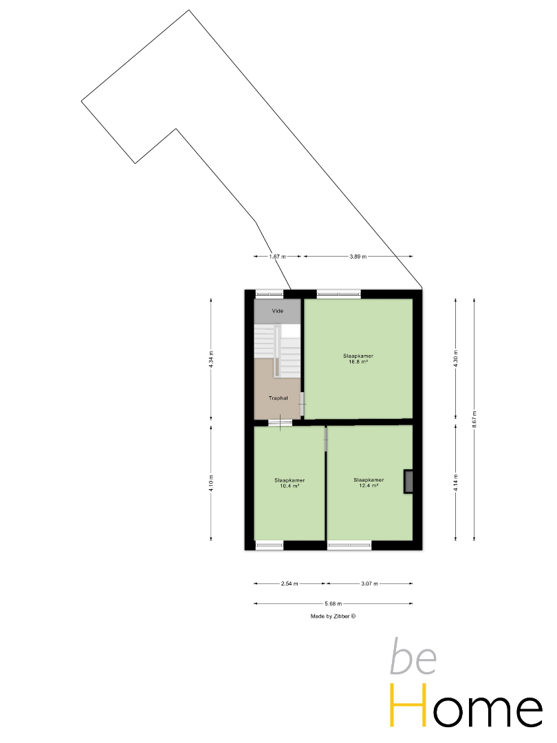 Op de verdieping bevinden zich drie slaapkamers van respectievelijk 16,8 m², 12,4 m² en 10,4 m², ideaal voor een gezin, thuiswerk of hobbyruimte.